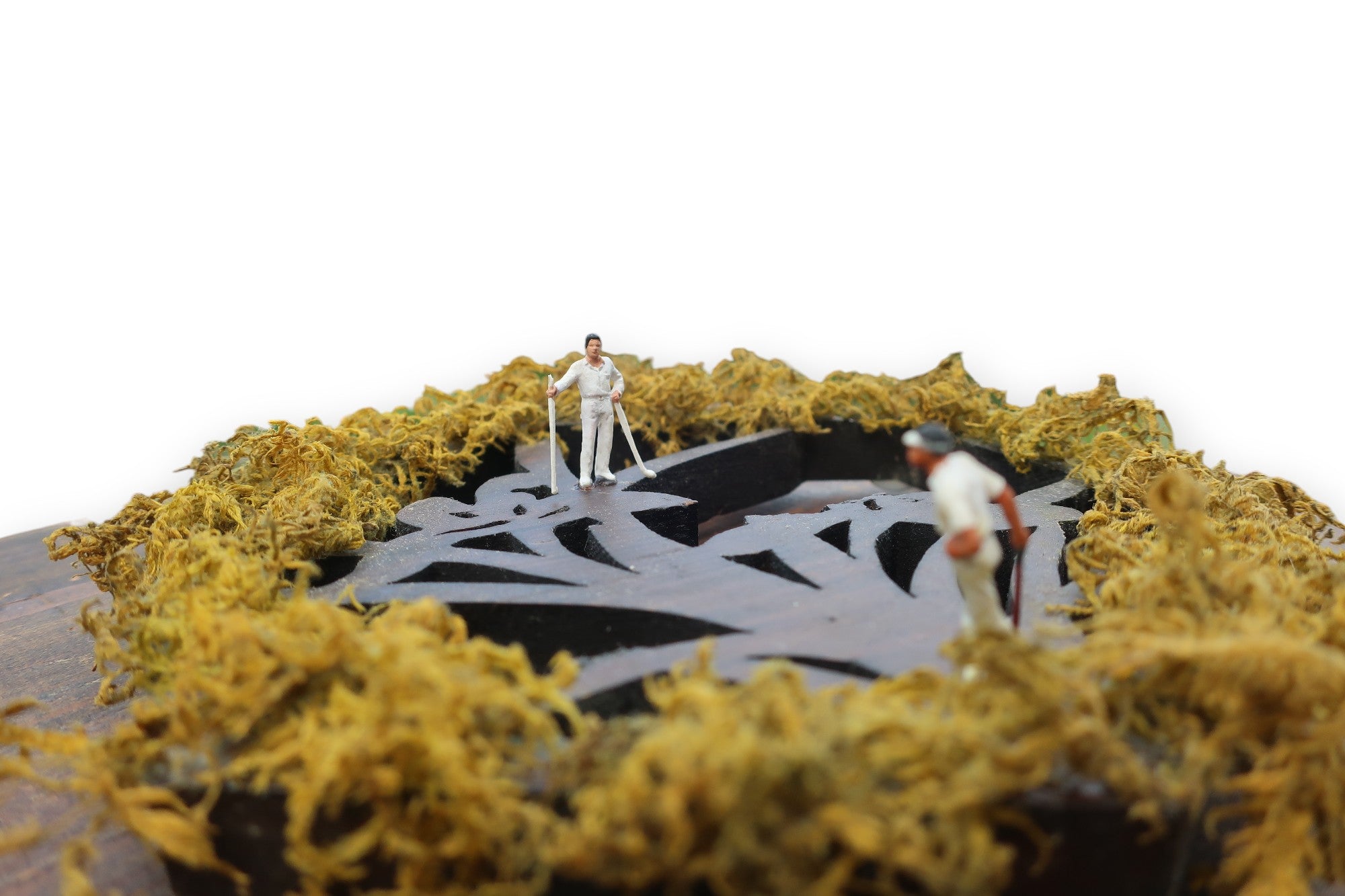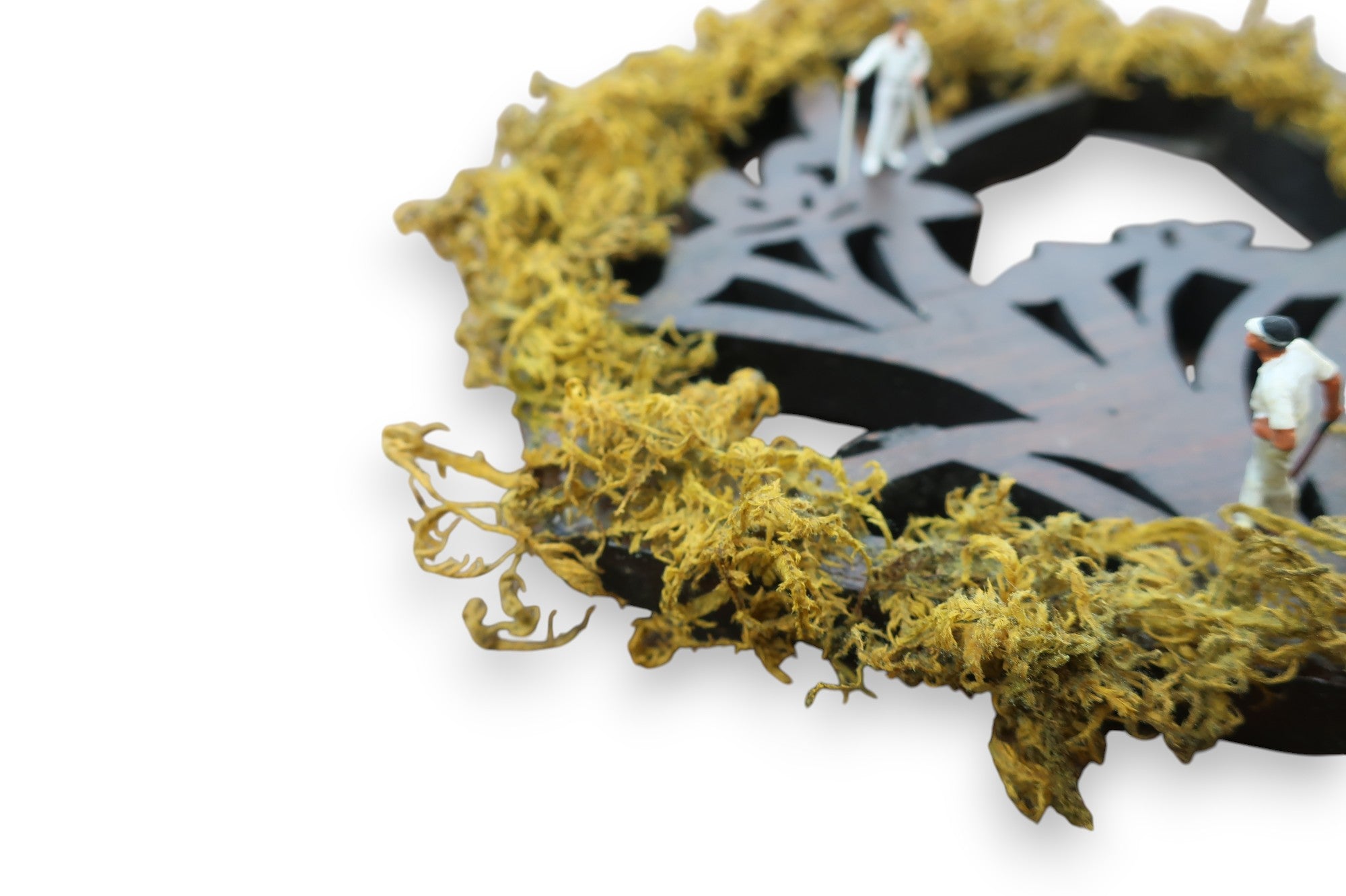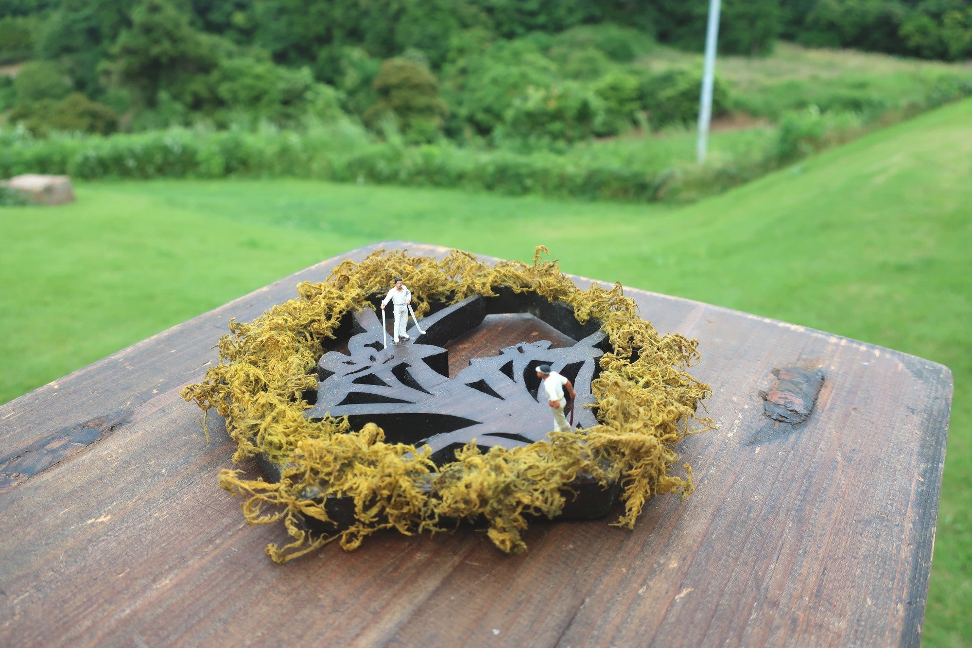 装飾台(アンティーク時代不明/木製)×ゴルファー(フィギュア)×ツヤゴケ(本物の苔を特殊加工)